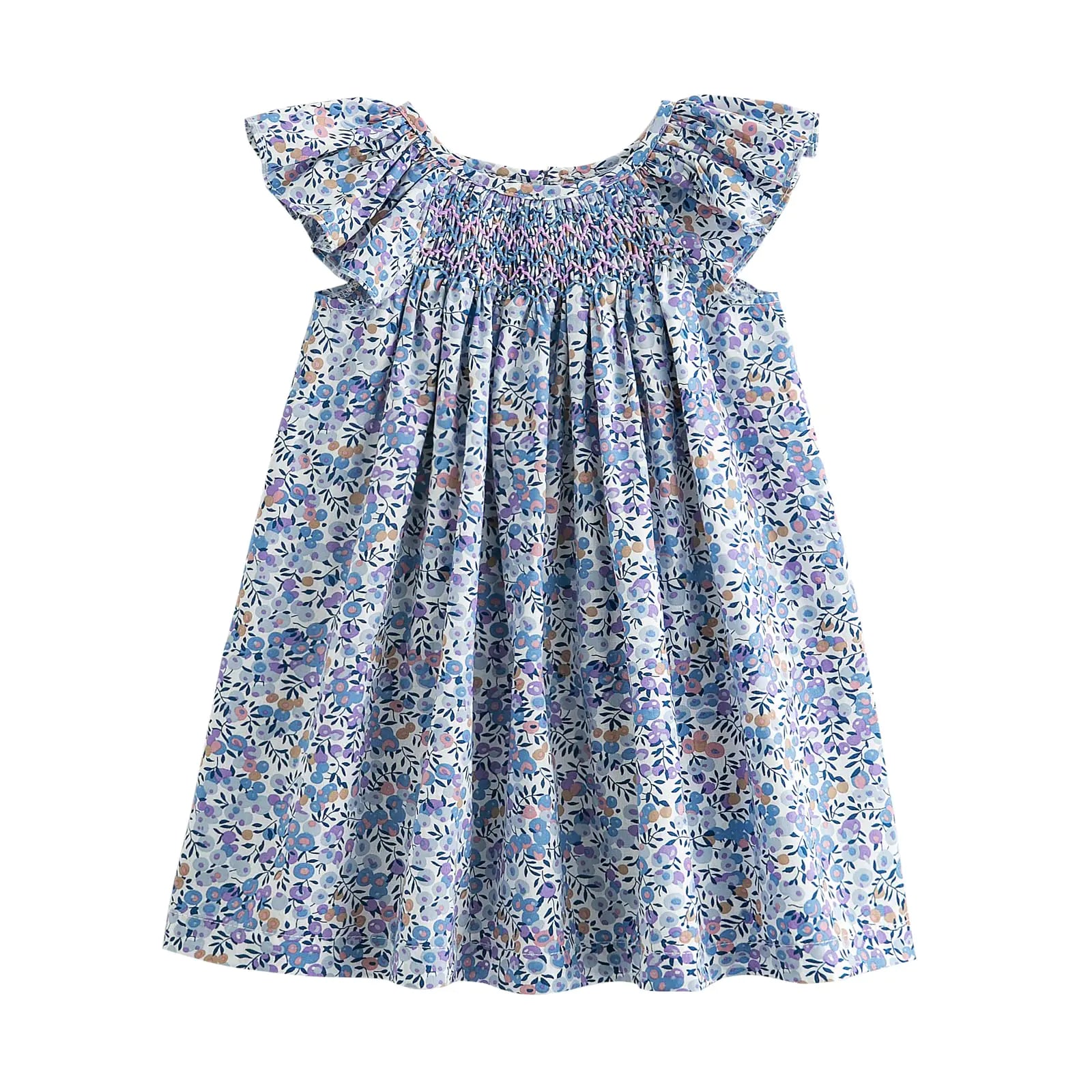 Crafted from a soft, breathable cotton blend, this dress features delicate smocking at the bodice and gently ruffled sleeves for a classic silhouette. The floral print evokes effortless elegance, perfect for family gatherings, celebrations, or everyday refinement.