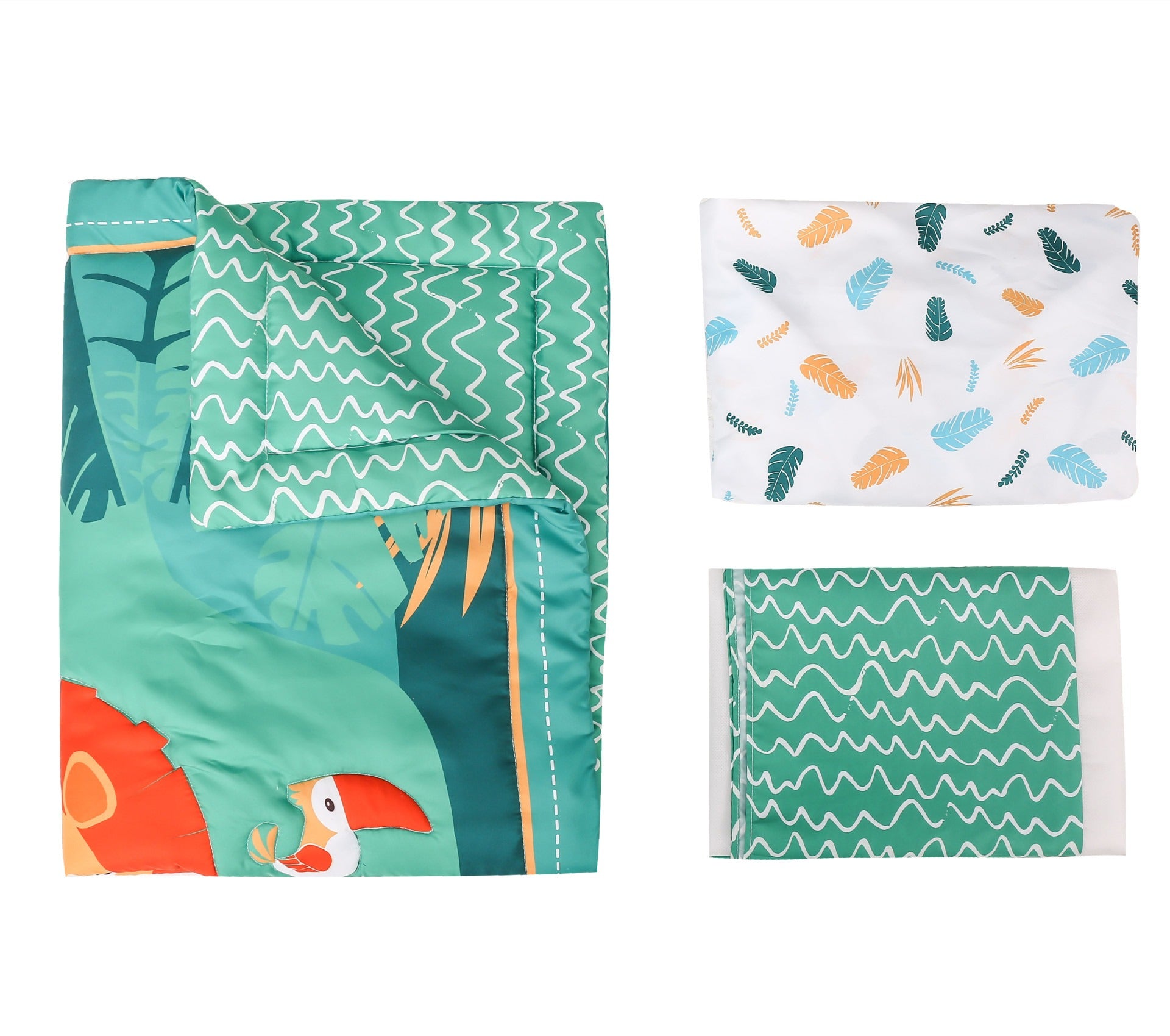 This children's crib bedding set includes a quilt, fitted sheet, and bed skirt, all sized for a 130x70cm small bed. Made from soft chemical fiber with a plain weave and digital printing design, it offers comfort and style for infants. The pack comes with three essential pieces for easy nursery setup. Simple and modern, it's ideal for baby and toddler bedrooms.