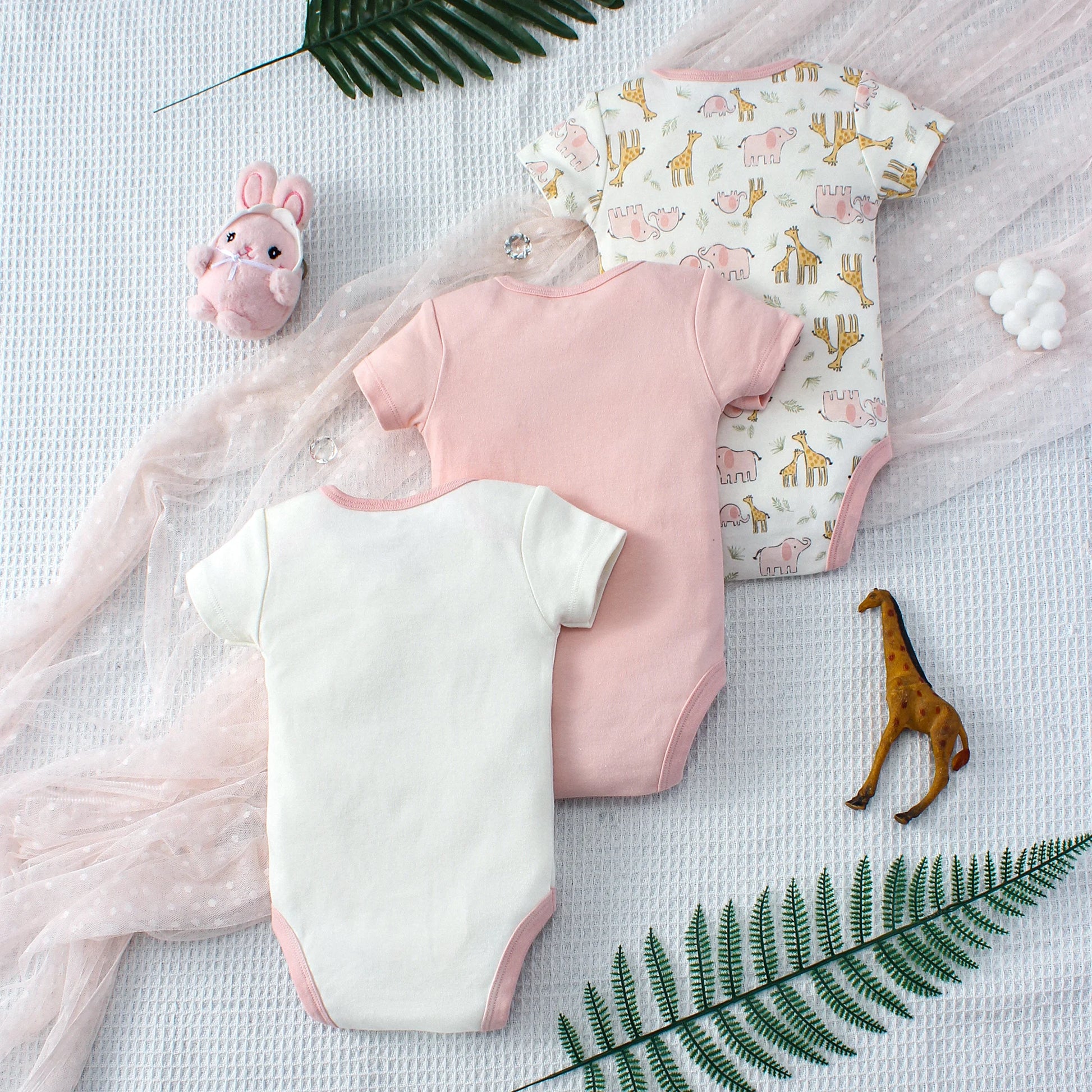 Éléphant d’Été – Three-Piece Baby Bodysuit Set A refined summer essential for newborn girls.