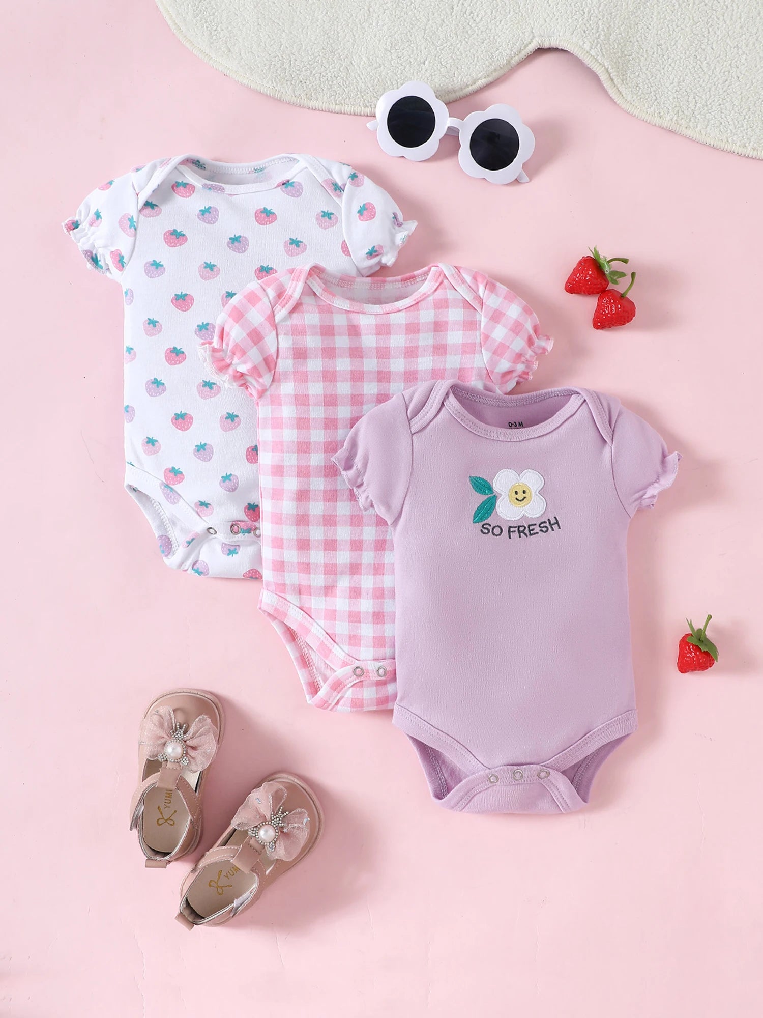 A delicate three-piece bodysuit set designed for a baby’s first summer.