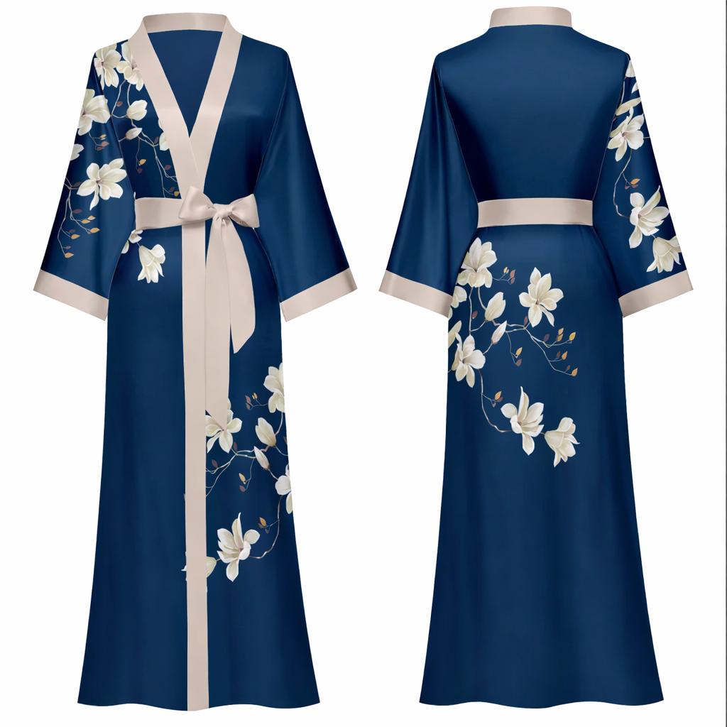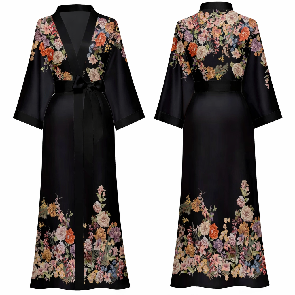 Jardin de Nuit Robe – Château Élégance Floral Satin Kimono Robe with Silken Tie
